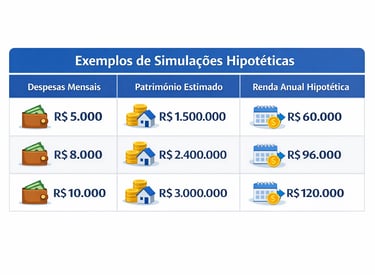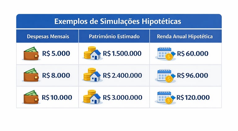 Esses exemplos mostram a relação entre padrão de vida, patrimônio e renda anual necessária para manter despesas ao longo do tempo. Os valores não representam rendimentos reais nem garantidos.