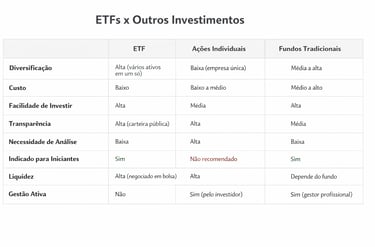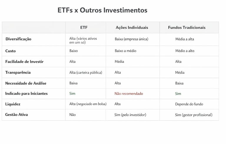 Os ETFs se tornaram uma escolha comum porque oferecem vantagens claras para quem busca eficiência na construção de uma carteira de investimentos.
