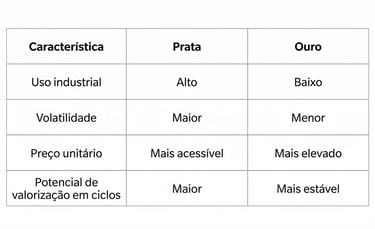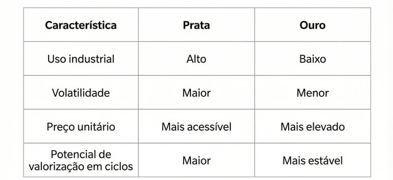 👉 Em ciclos de recuperação econômica ou expansão industrial, a prata tende a se destacar.