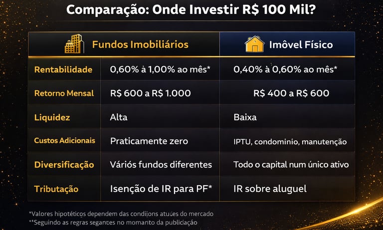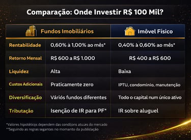 Saiba como investir R$ 100 mil em imóvel físico ou fundos imobiliários, comparando riscos, rentabilidade e vantagens de cada opção para seu patrimônio.